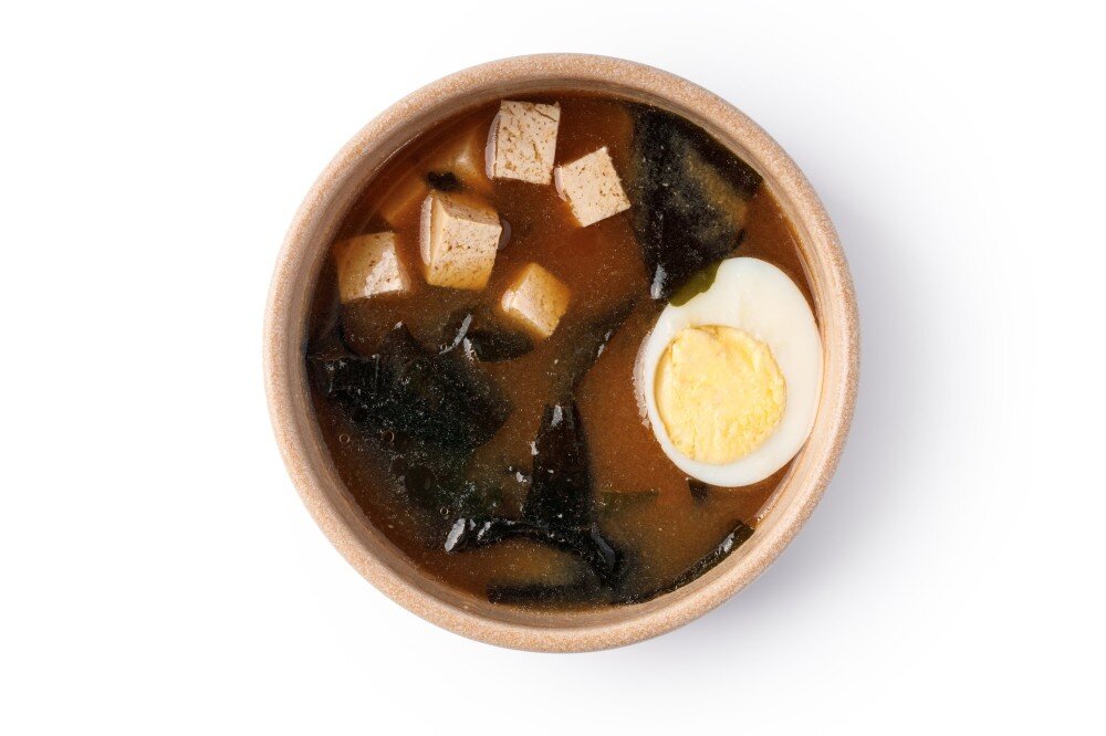 Лёгкий мисо суп из морской капусты, с тофу и отварным яйцом